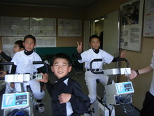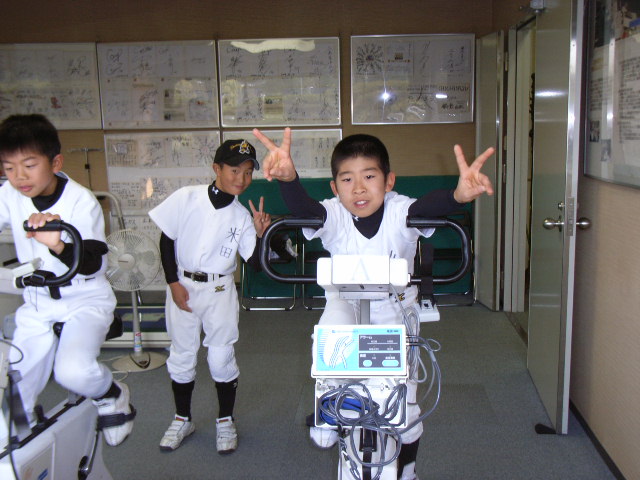 3グループに分かれ、自転車こぎ→前屈→握力→目をつぶって片足立ち→腹筋→全身反応→身体測定と、こんな感じで測定していきます。
